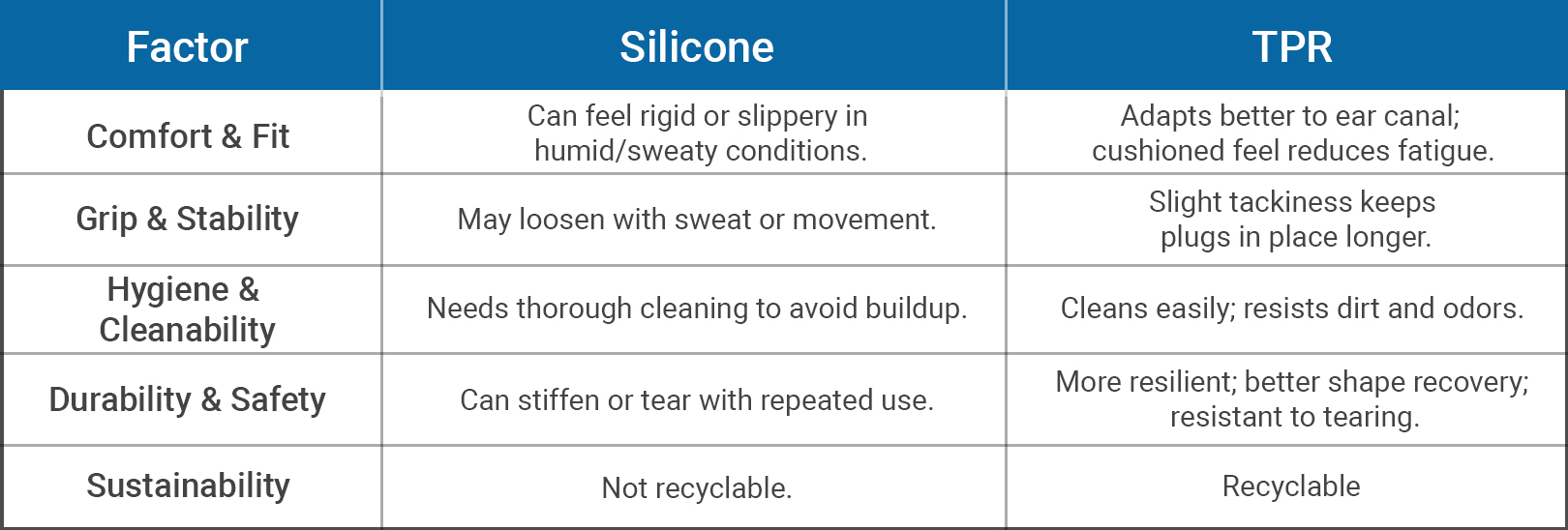 When it comes to choosing the best material for reusable earplugs the decision goes beyond comfort. The material impacts hygiene durability cost and whether workers keep them in place during long shifts. While silicone has long been used in hearing protection thermoplastic rubber TPR is proving to be the better choice for many industries.