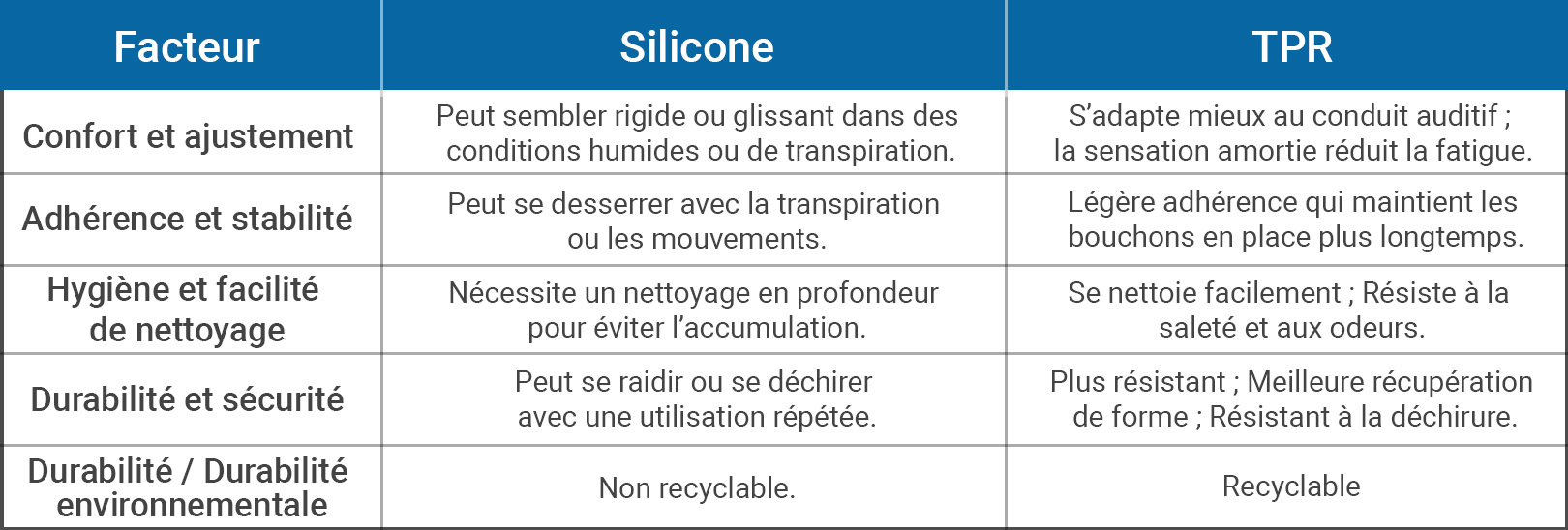 Lorsqu’il s’agit de choisir le meilleur matériau pour des bouchons d’oreilles réutilisables, la décision va bien au-delà du confort. Le matériau influence l’hygiène, la durabilité, le coût et même la volonté des travailleurs de les garder en place pendant de longs quarts de travail. Bien que le silicone ait longtemps été utilisé dans la protection auditive, le caoutchouc thermoplastique (TPR) s’impose désormais comme un meilleur choix pour de nombreux secteurs.