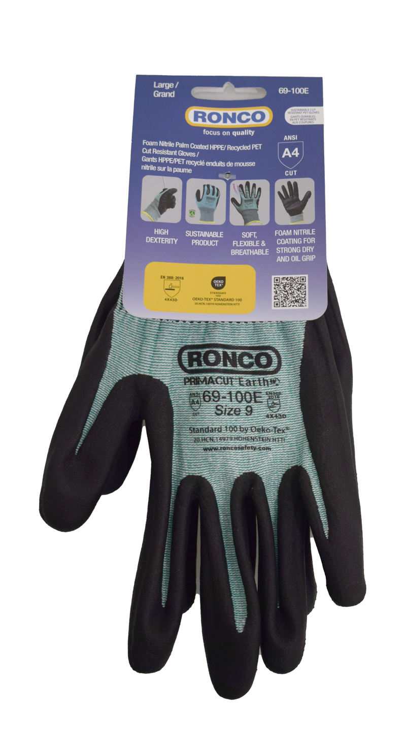 PRIMACUT™ Earth 69-100E are sustainable, cut-resistant foam nitrile-coated gloves from RONCO, certified under the Recycled Claim Standard (RCS).