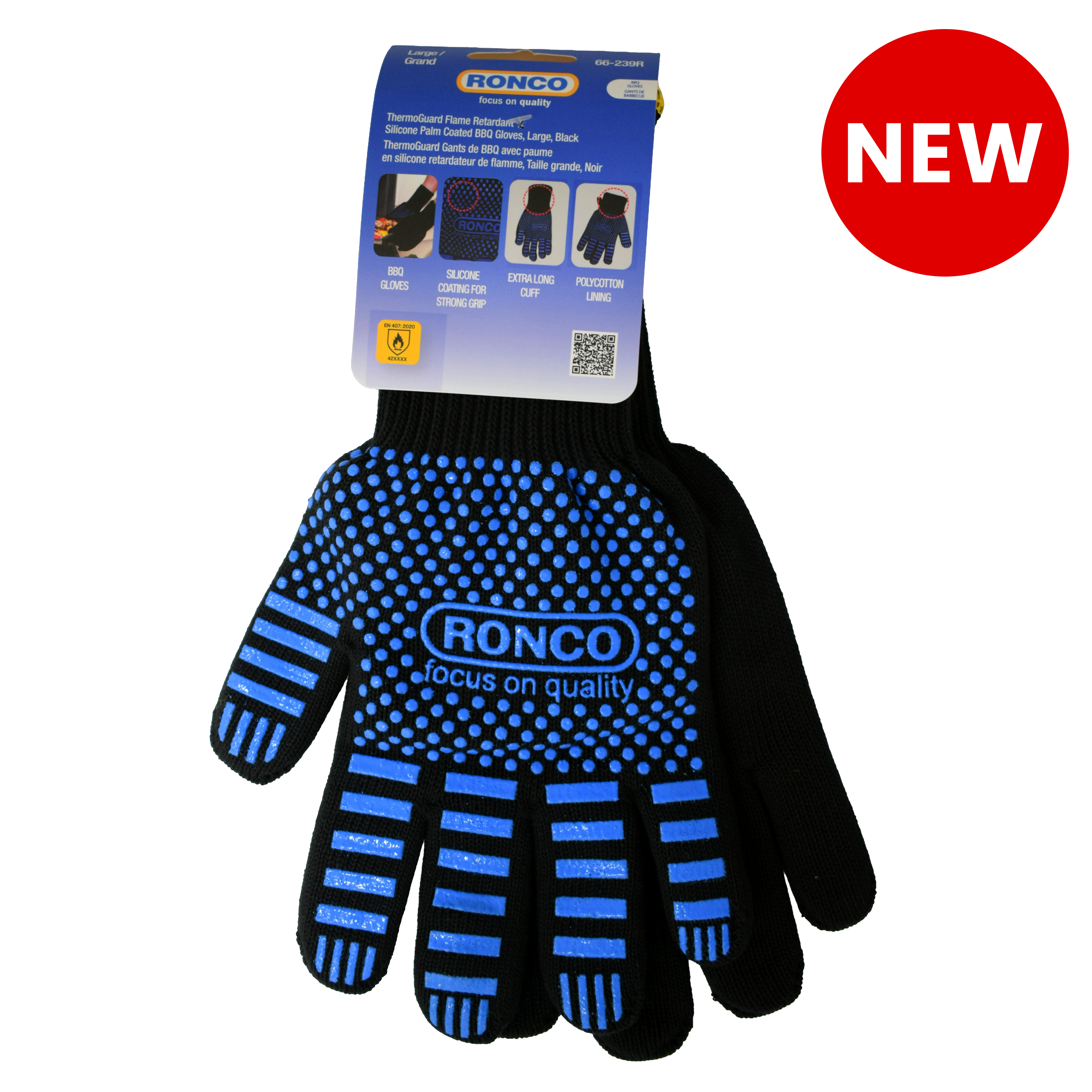 The ThermoGuard™ Flame Retardant Silicone Palm Coated BBQ Gloves by RONCO offer superior heat resistance and protection for high-temperature tasks like grilling, baking, and food preparation. They are also available in Retail Ready packaging.