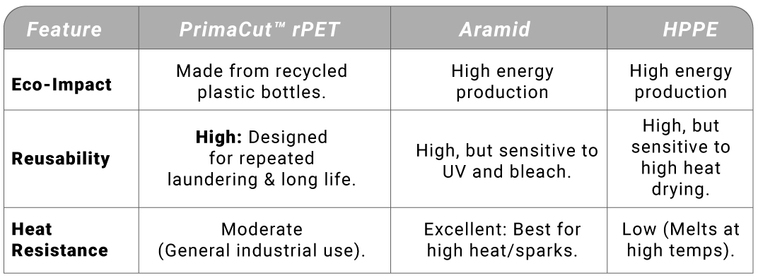 When choosing a reusable sleeve, most managers look at Aramid or HPPE. Here is how the PrimaCut™ rPET stands out against the “old guard”: